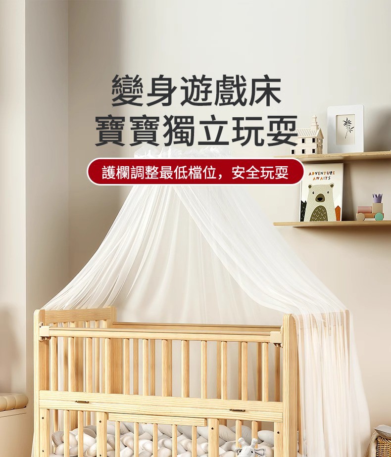 12分鐘前陪伴寶寶成長,永不閒置【嬰兒床-->遊戲床-->書桌】日本超火の可折疊嬰兒床,實木無漆更安心,可拼接大床+滑輪移動,多功能設計陪寶寶成長! - 【118*68*85cm】折疊大床+蚊帳