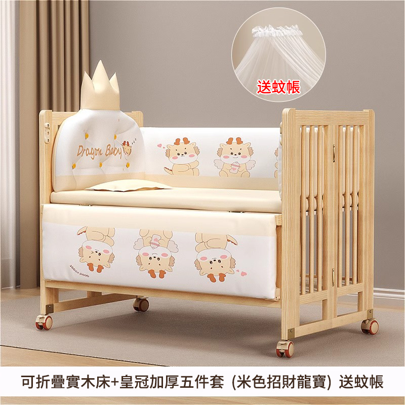 5分鐘前陪伴寶寶成長,永不閒置【嬰兒床-->遊戲床-->書桌】日本超火の可折疊嬰兒床,實木無漆更安心,可拼接大床+滑輪移動,多功能設計陪寶寶成長! - 【118*68*85cm】折疊大床+五件套+蚊帳